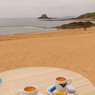 Nous débutons par le tour des murs de la Cité corsaire ☠️ et la promenade du Sillon. Au milieu, une terrasse plein soleil nous attend, nous ne pouvons pas résister à un café, les pieds dans le sable. 😉