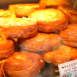 Saint-Malo, intra-muros c'est aussi ses très belles demeures, ses drapeaux, et ses Kouign amann, littéralement gâteau au beurre en breton 🥞. Connaissez-vous l'histoire du Kouign amann, en gourmande que nous sommes. Nous allons vous la conter. Il a été créé par Yves-René Scordia en 1865, alors qu'il n'avait plus rien n'à vendre dans sa boulangerie et qu'il lui restait uniquement du beurre, du sucre et de la pâte à pain. Il a créé cette recette. Bien sûr au fil du temps, elle s'est améliorée et bonifiée avec dorénavant ce délicieux feuilletage. Mmmmh, encore, encore.... 😋